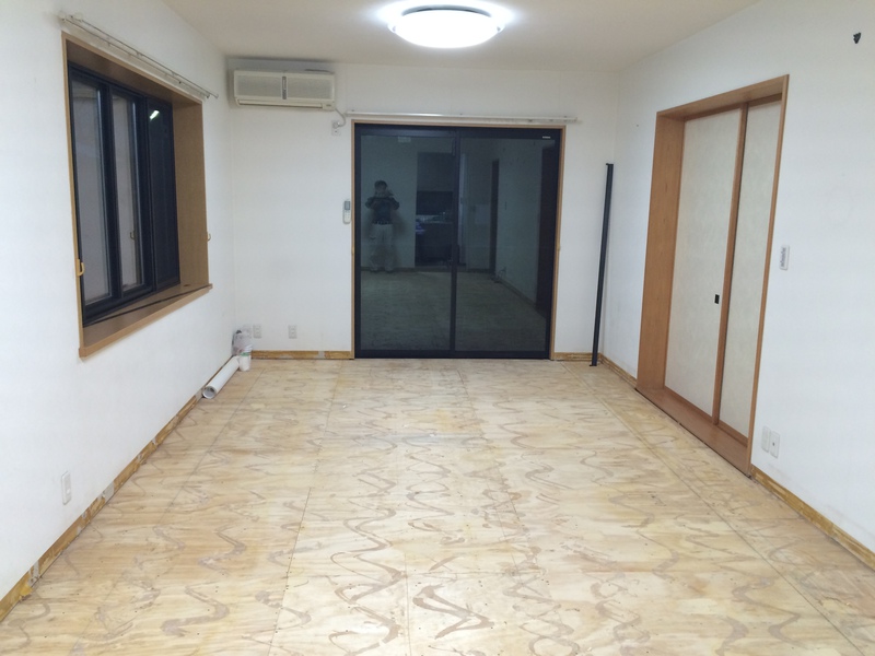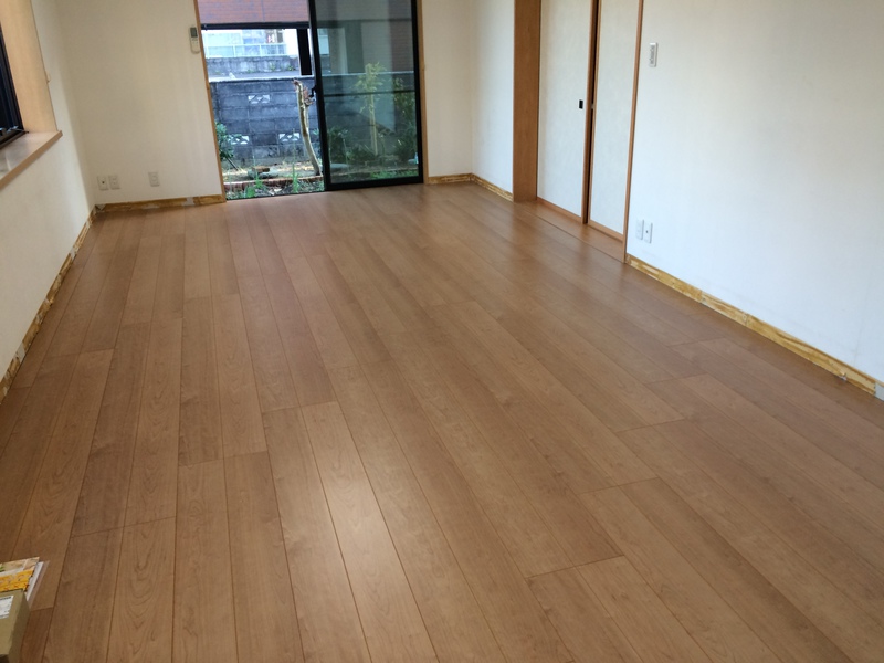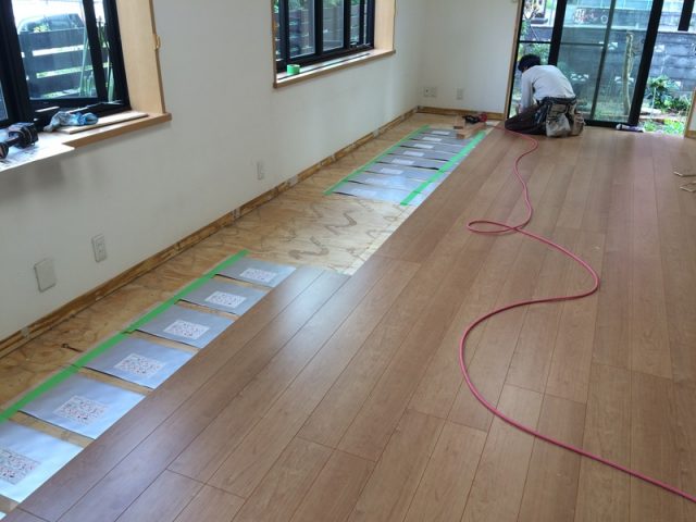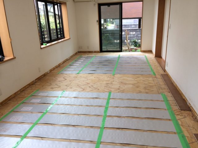 既存フローリングをはがし、電気式の床暖房マットを敷き詰め新しいフローリングを貼っています。