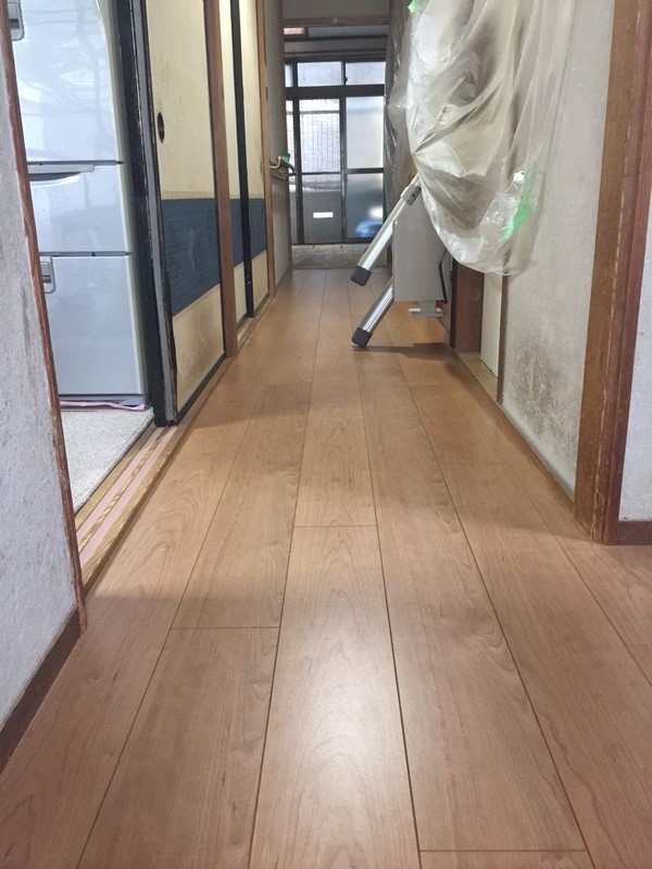 K様改装工事 新築住宅 廊下の古くなった床を下地として使い新しいフローリングを上から重ねて施工。 古い床も下地としてはまだまだいけます! 綺麗な仕上がりに変わりました。 フローリング:リクシル製フロアー材使用